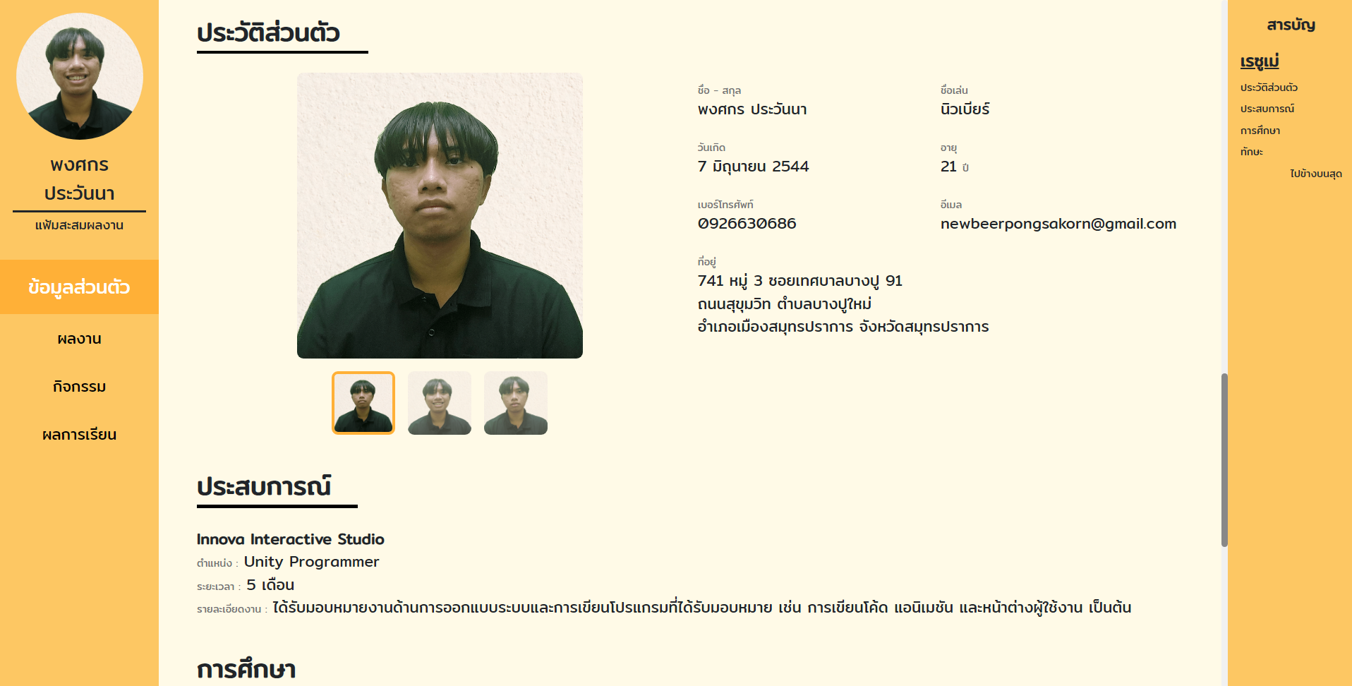เว็บไซต์ที่เอาไว้แสดงข้อมูลของผม โดยมีการโชว์ข้อมูลส่วนตัว ผลงาน กิจกรรมต่าง ๆ เป็นต้น